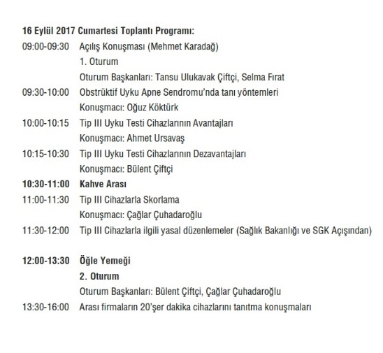 American Academy of Sleep Medicine (AASM) tarafından 2017 yılında yayınlanan yeni OSA Tanı rehberinde önerildiği şekilde Tip III cihazlarla EVDE UYKU TESTİ ile ilgili olarak 16 Eylül 2017 Cumartesi günü Crown Plaza Hotel Ankara’da Uykuder tarafından bir ‘Bilgilendirme Toplantısı’ yapıldı.