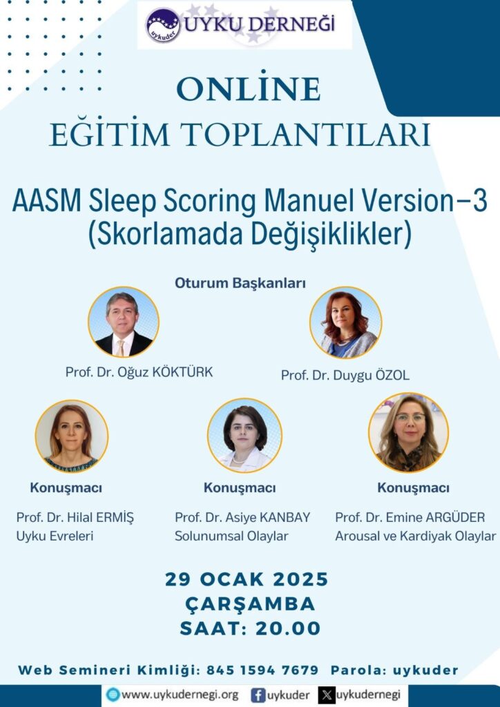 Prof. Dr. Oğuz KÖKTÜRK ve Prof. Dr. Duygu ÖZOL’un moderatörlüğünde Prof. Dr. Hilal ERMİŞ’in “Uyku Evreleri”, Prof. Dr. Asiye KANBAY’ın “Solunumsal Olaylar” ve Prof. Dr. Emine ARGÜDER’in “Arousal ve Kardiyak Olaylar” başlıklı konuşmalarının olduğu online toplantımız 29 Ocak 2025 Çarşamba günü saat 20:00’da gerçekleşecektir. Siz üyelerimizi toplantımızda görmekten mutluluk duyarız.